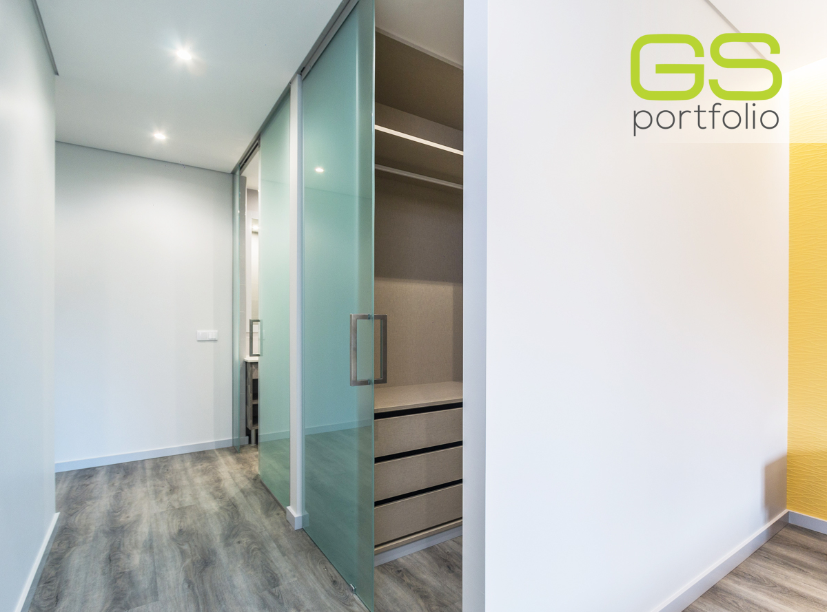 - INSIDE DV sliding door system by OPENSPACE with fixed frosted glass panel, combined with frosted glass sliding door!