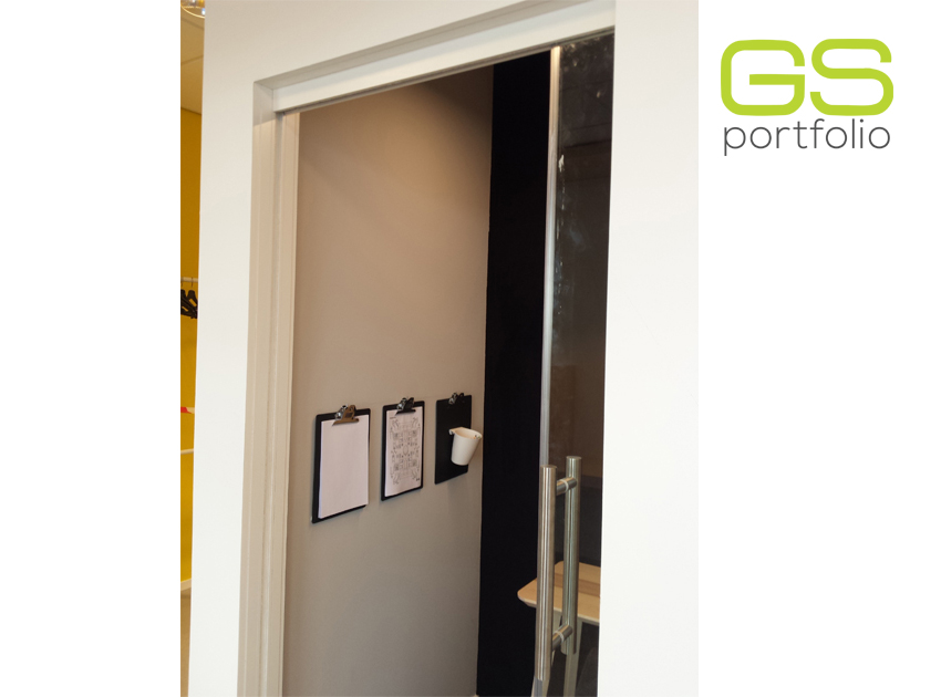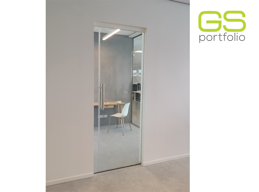 Frame for sliding door (UNICO model) with translucent glass door and upper aluminum flap. By OPENSPACE!