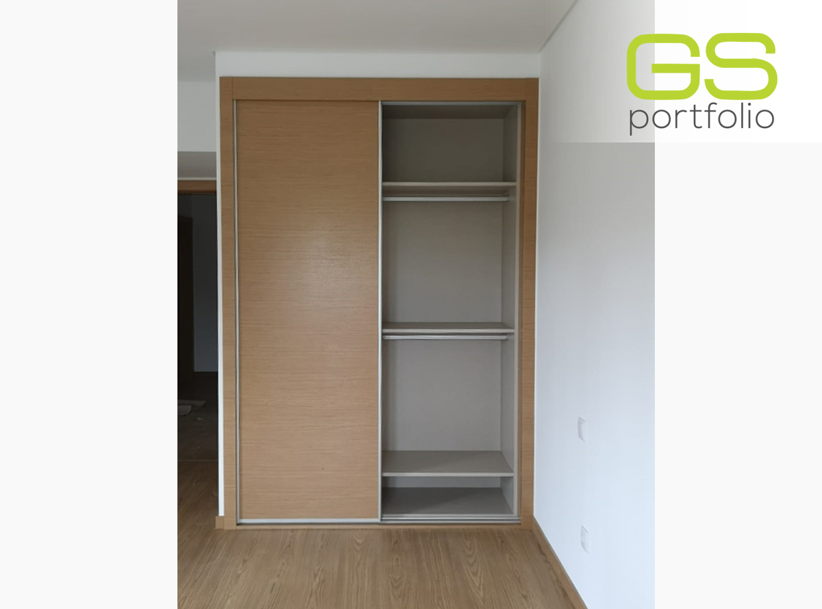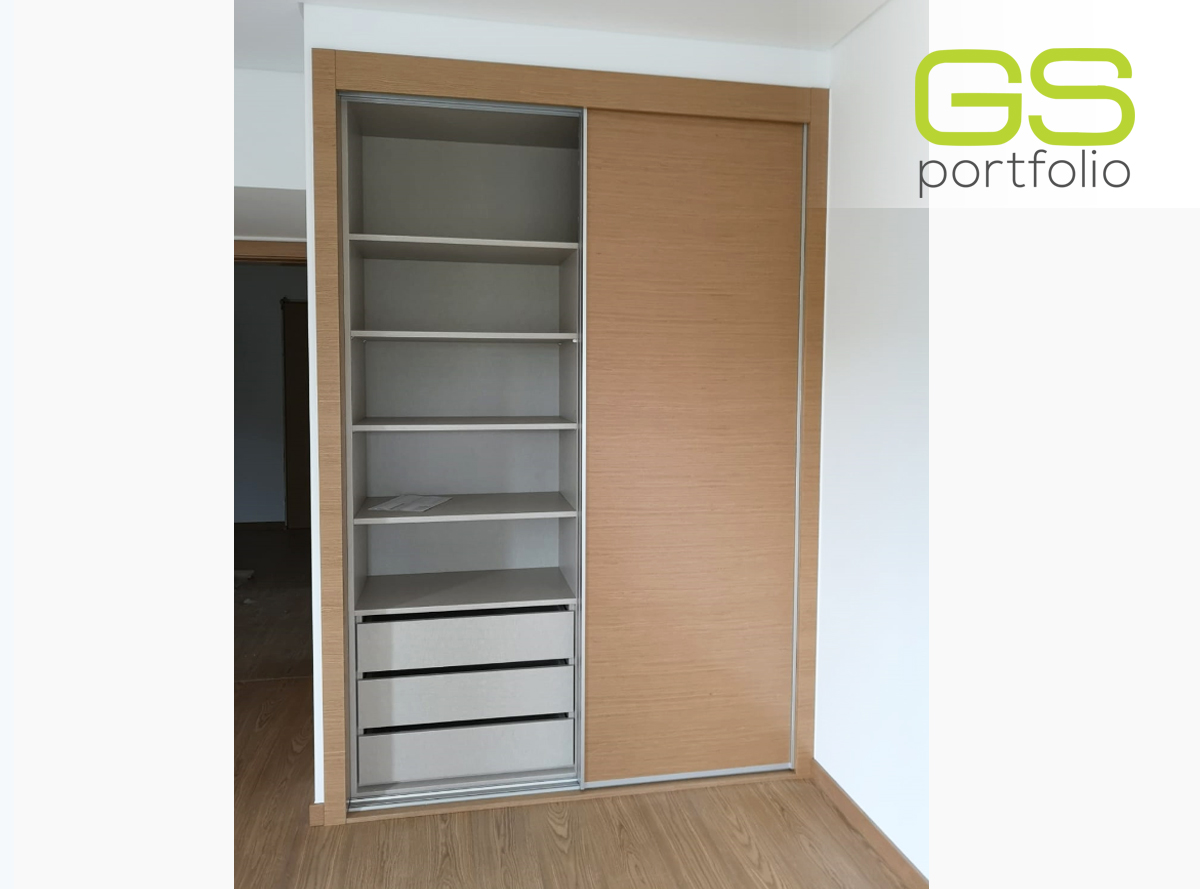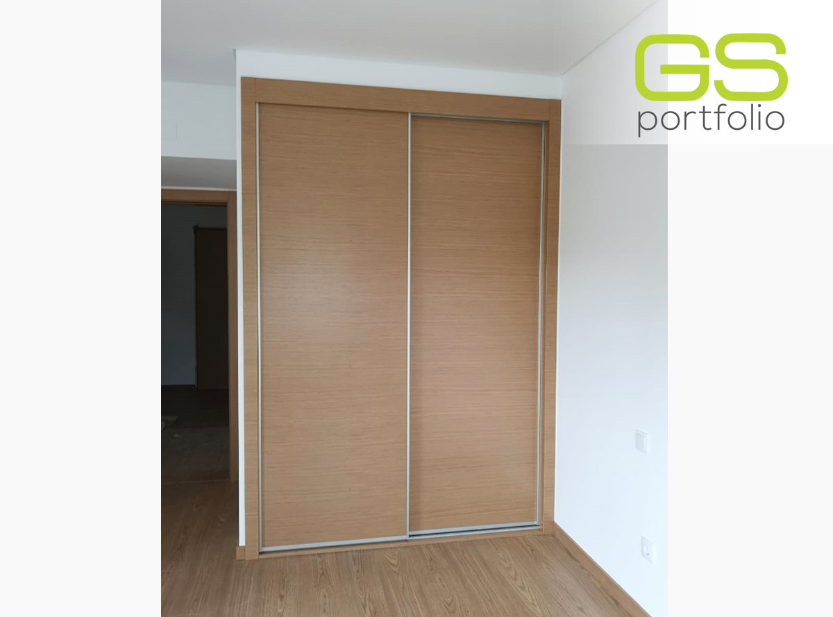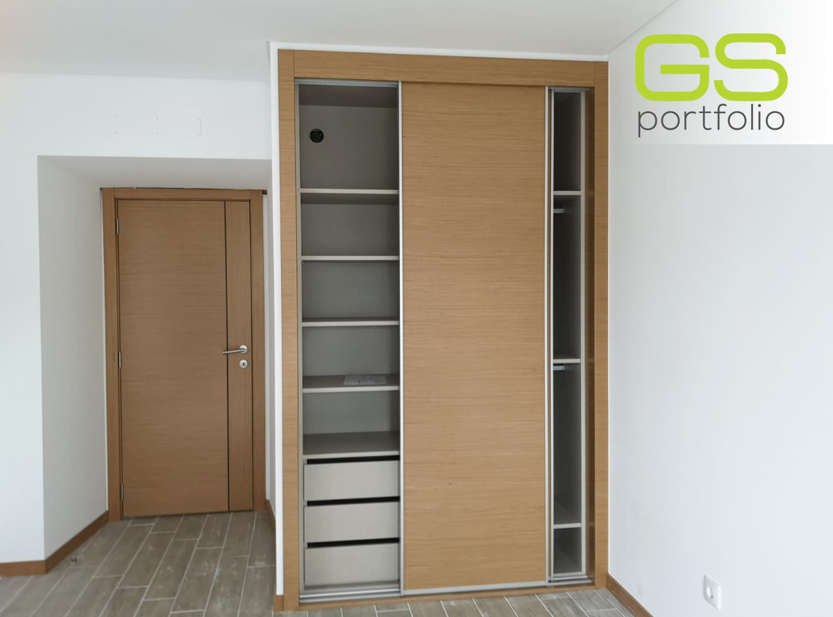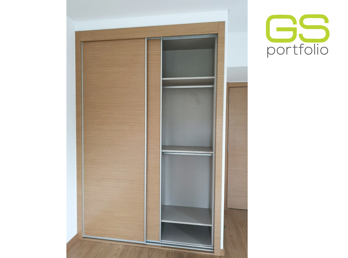 - GS CONCEPT built-in wardrobe with 2 sliding doors in vinyl: Natural Oak and aluminum handle side profile.
