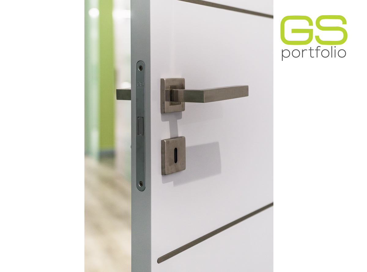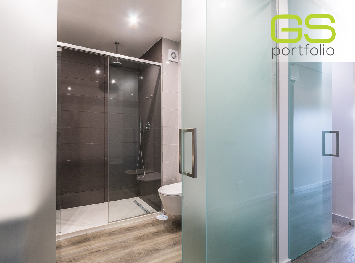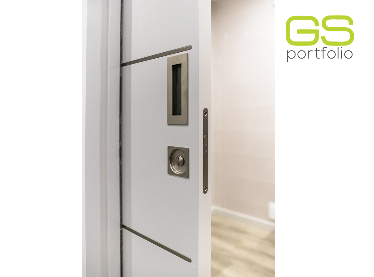- Puerta batiente modelo PLUS (hasta el techo) de GS DOORS, en lacado blanco mate con esquinas. Cerradura magnética.