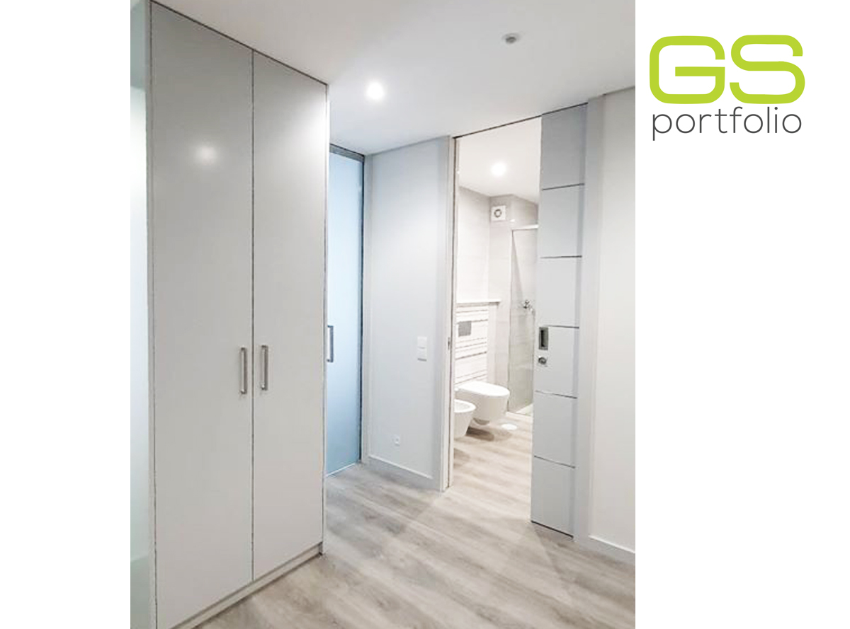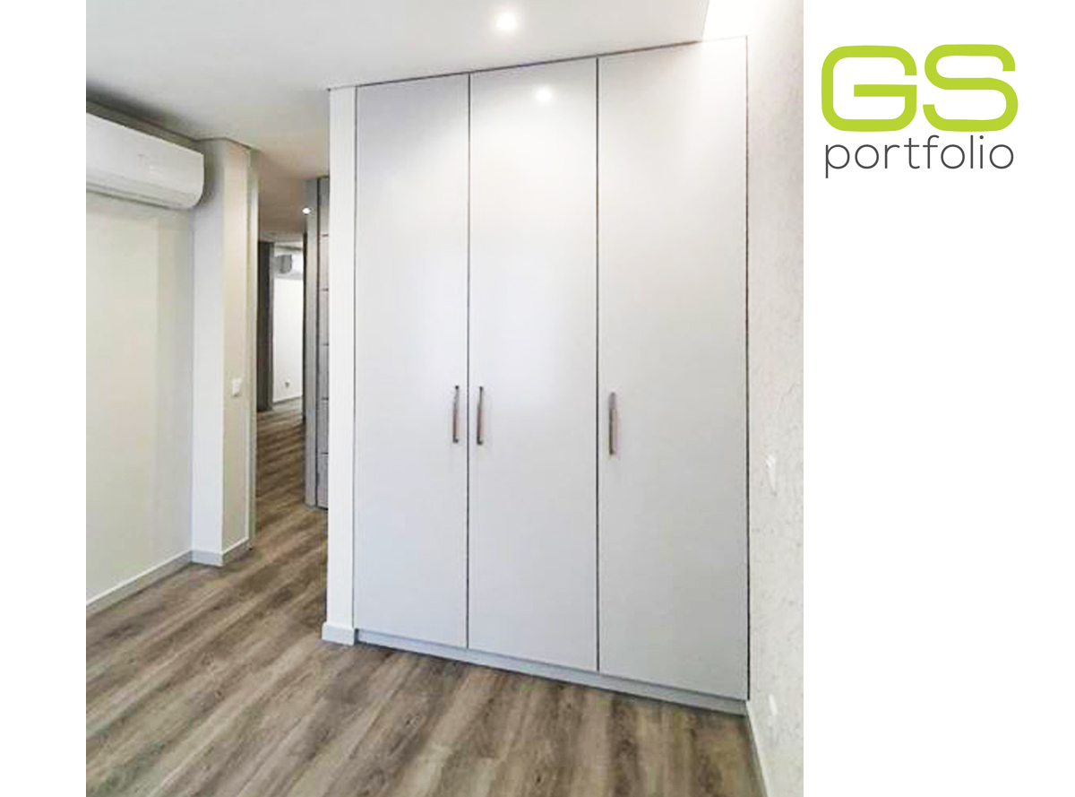 - Armario empotrado con puertas batientes en lacado blanco mate de GS CONCEPT. Cajones con correderas ocultas y sistema de cierre suave.