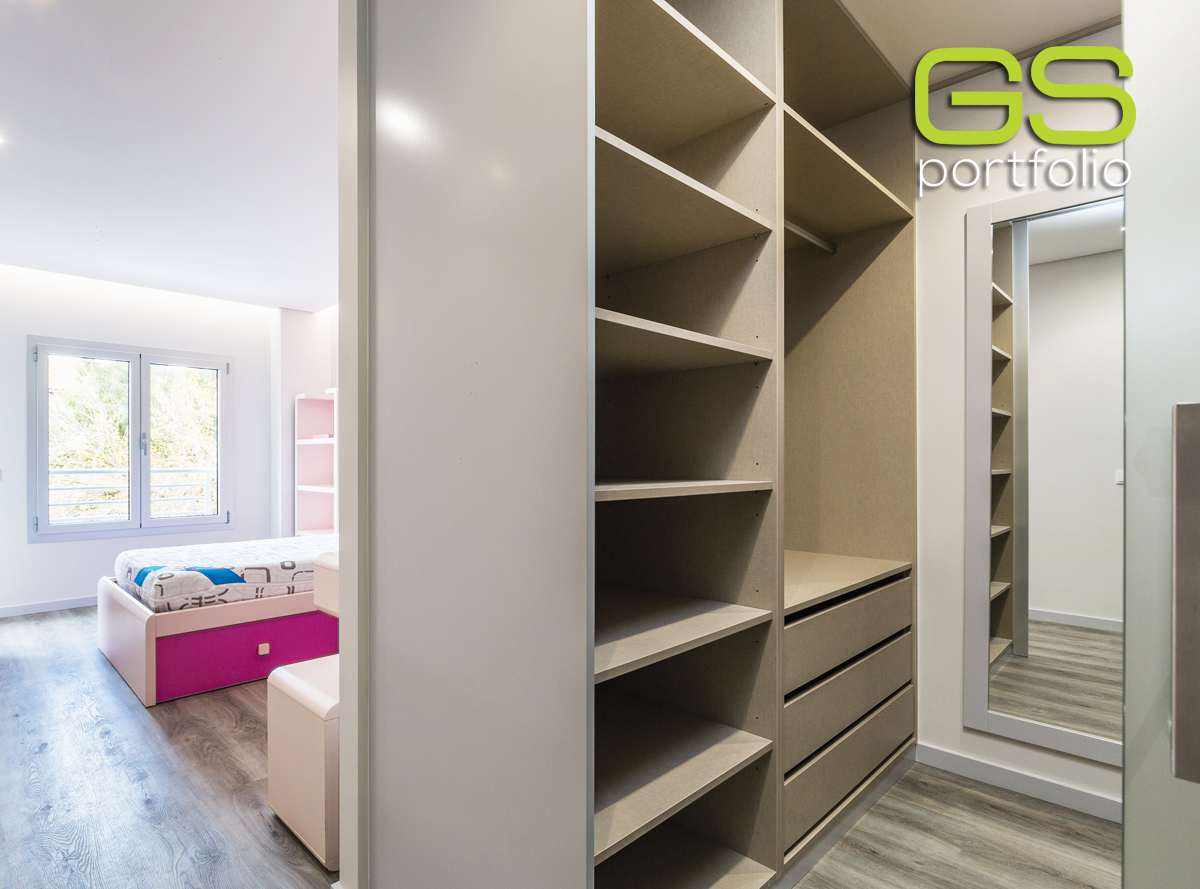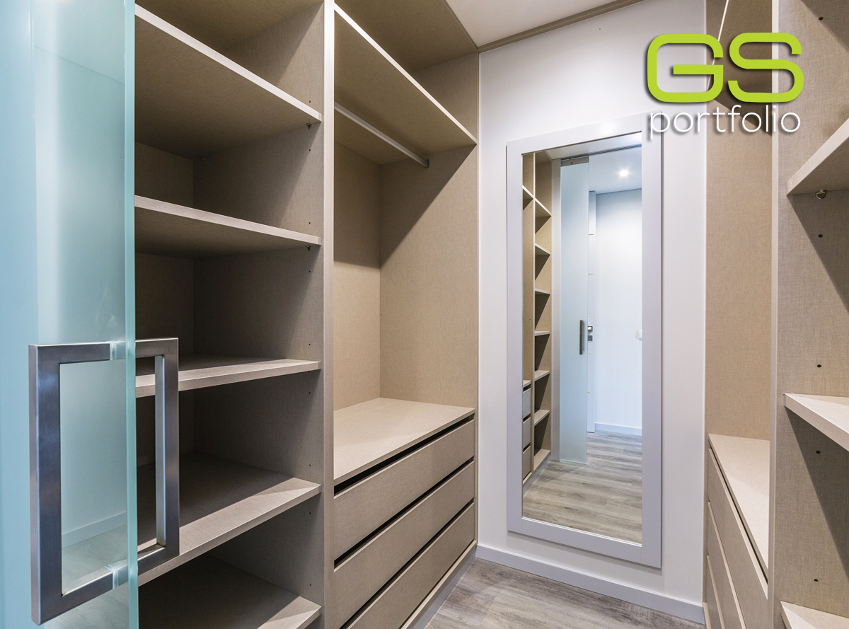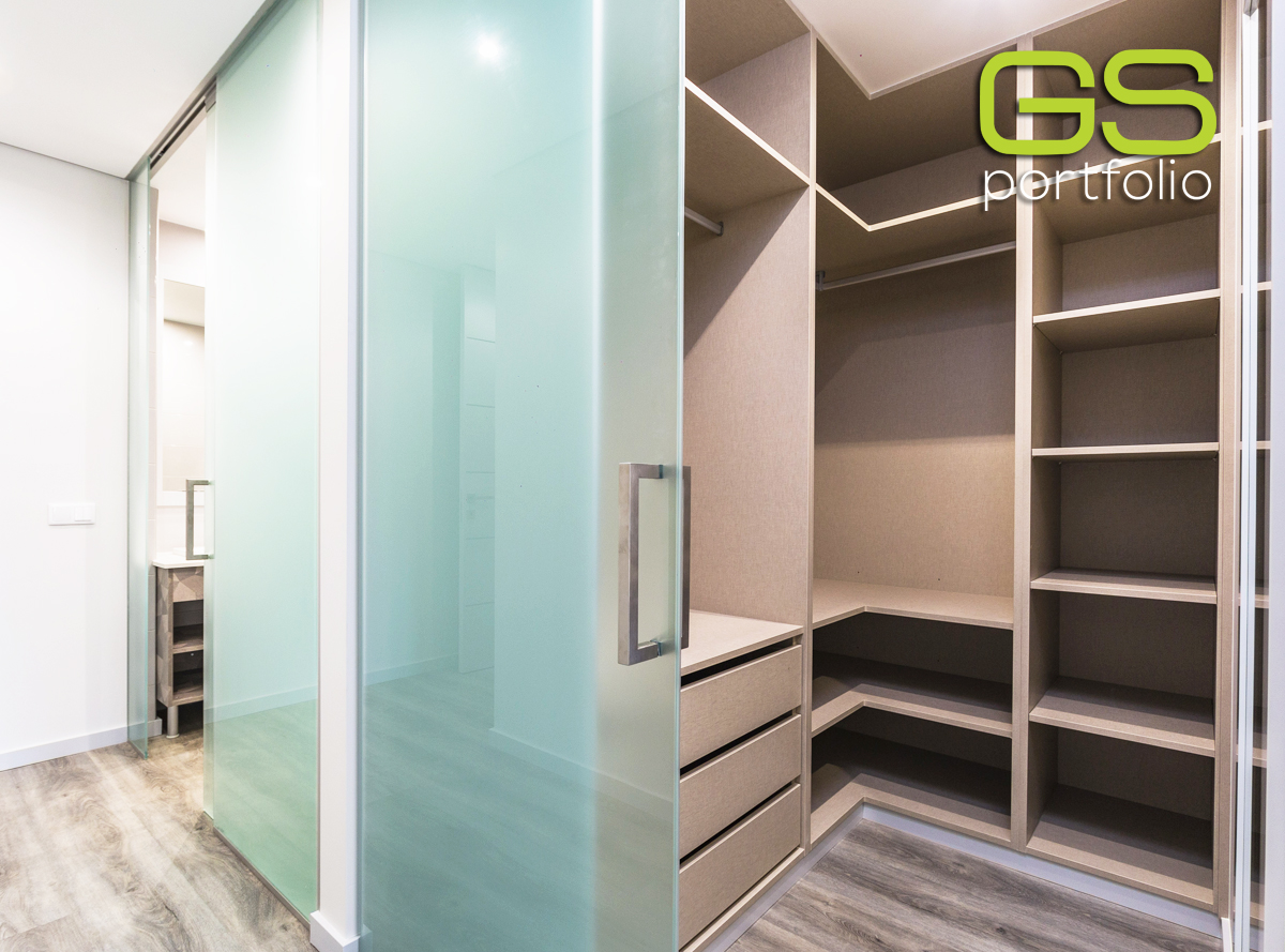 - Armario con separadores, zapatero y cajones con correderas ocultas y sistema de cierre suave de GS CONCEPT. Compartimento cerrado con puerta corredera de cristal esmerilado blanco.