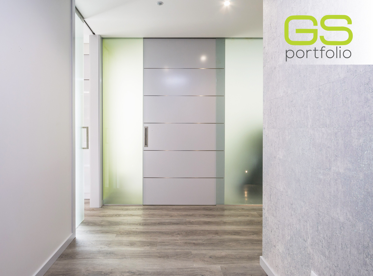 - Sistema de puerta corredera INSIDE de OPENSPACE con puerta lacada en blanco mate con esquinas. Conjugado con panel fijo de vidrio blanco mate con esquinas.