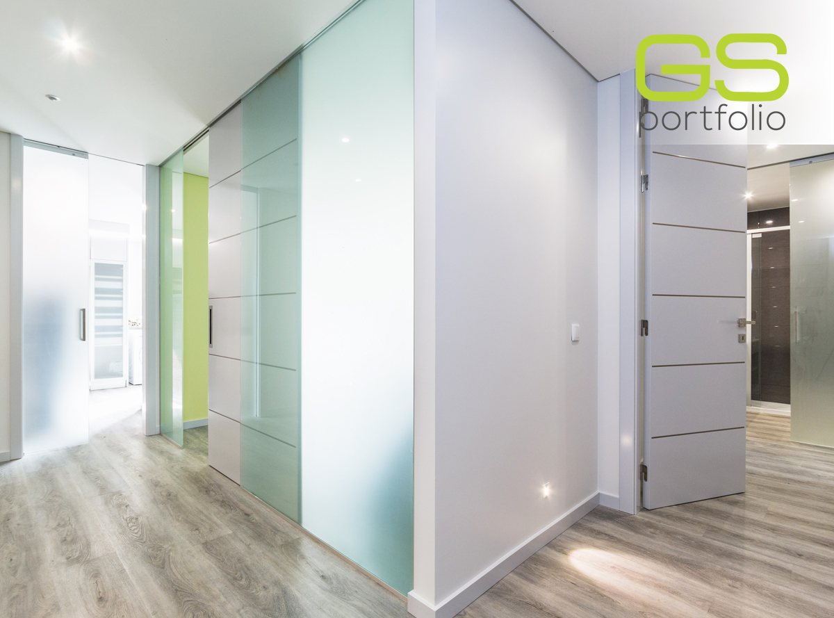 - Sistema de puerta corredera INSIDE DV by OPENSPACE con panel fijo de vidrio esmerilado, combinado con puerta corredera de vidrio esmerilado.